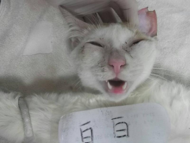 白白有眼鼻分泌物及打喷涕等鼻氣管炎的症狀且有貧血和白血球偏低的現象,除此其背部有傷口須鎮定清創後再手術縫合。