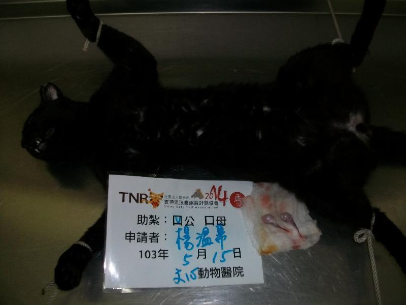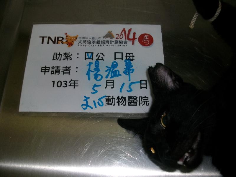 誘捕者暱稱: 楊溫蒂 性別: 公 花色: 黑貓 誘捕地點: 大坪林 結紮醫院: 文心動物醫院 結紮費用: 800 助紮者: 已付款:米漿x1, Erin Wangx2 額外醫療費用申請: 特別說明與誘捕心情: 20140508 倪小姐通報求援案件:大坪林捷運站京采飯店後方垃圾處理場 這裡貓隻群聚 看到的大多是虎斑 白底虎斑 混阿比虎斑 大約8,9隻(第二趟深夜再去抓貓時倪小姐有親到現場意外發現沒見過的浪公貓數隻圍堵落單母貓輪流要播種,當場看了傻眼~所以初估不只8.9隻而是加一加有十幾隻呢~)