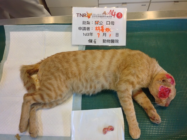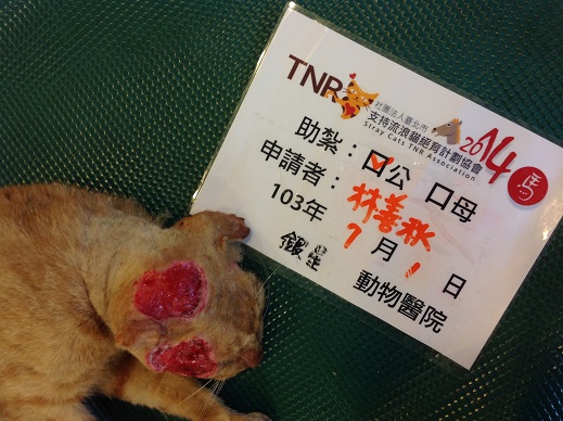 餵養區側邊的浪浪,之前就有看過他,耳朵長得非常特別,讓人非常有印象,幾天不見,發現他的頭居然出像兩塊大傷口,趕緊設籠捕捉結紮,傷口有些大,會在醫院多休養幾天,謝謝大家贊助結紮及醫藥費