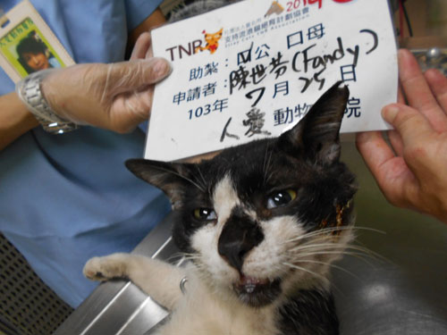 誘捕者暱稱: Fandy 性別: 公 花色: 黑白賓士黑鼻 誘捕地點: 前鎮區英明路巷子 結紮醫院: 人愛動物醫院 結紮費用: 700 助紮者: 已付款:karenax1, karenax1, cutx1, 小秋x1, 曉秋x1, Gina Leex1 額外醫療費用申請: 1000 特別說明與誘捕心情: 這隻貓是我的餵養區新出現的貓,餵了大概一個多月,最近比較信任我會靠近,打算抓來結紮,平常都晚上餵,捕抓當天下午看到他出現,拿著籠子去抓,才看到臉上有受傷紅紅流血,可能是打架受傷,心想一定要抓來治療,耗了快一小時抓到。