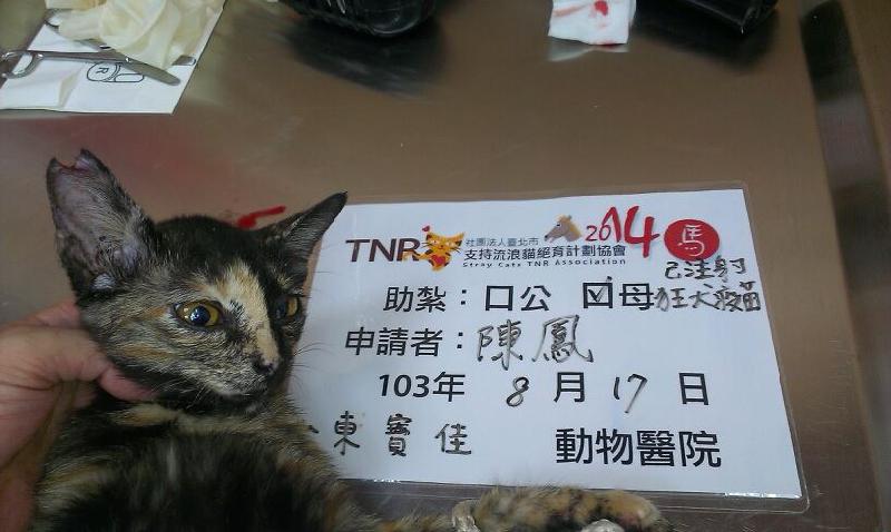 廣東路是我的餵食區,這帶的大貓不大容易進,我還會再努力,此玳瑁是這群都快五個月的浪浪,所以還有好幾隻要抓了,只要浪浪進籠,不管公貓或母貓都要紮,雖然希望母貓都能進籠,但大隻的就比較有戒心,是我要突破的難題,謝謝醫院有幫她打狂犬病疫苗,也謝謝協會的幫忙,更謝謝捐助的大德,感謝您們~