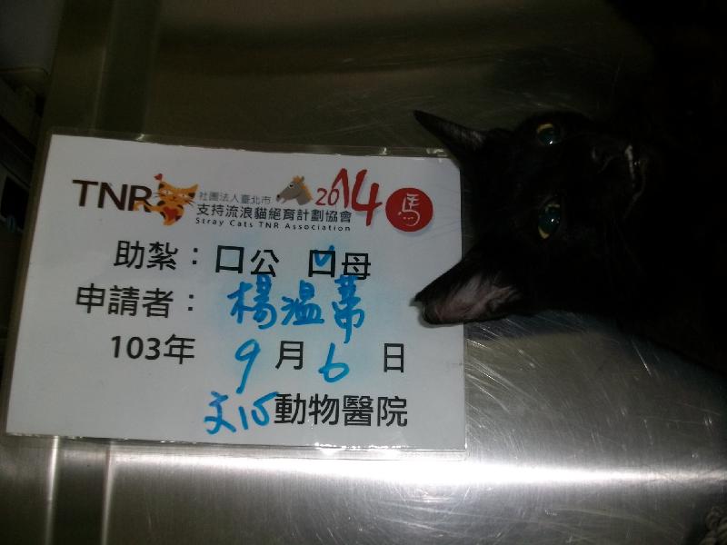 誘捕者暱稱: 楊溫蒂 性別: 母 花色: 黑貓 誘捕地點: 基隆西定國小旁 結紮醫院: 文心動物醫院 結紮費用: 1500 助紮者: 已付款:calvin chaingx1, lilix2, ShowRong Linx1, 黃綠玫x1 額外醫療費用申請: 特別說明與誘捕心情: 2014~ 基隆老家西定國小旁巷內真的很多浪貓.雖然我搬離有十年之久但在每每回去探親就覺得難過 母貓尤其多 去年TNR了幾隻母貓 今年趕緊腳步繼續處理漏網母貓及其之前生下來而有幸存活的第二代浪貓 讓鄰居們不困擾 雖然浪貓吃廚餘雜物 起碼數量在控制中~~
