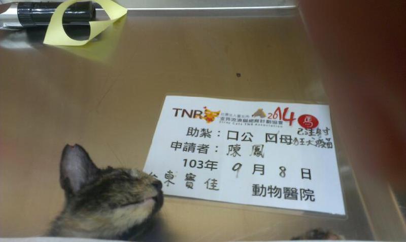 誘捕者暱稱: 陳鳳 性別: 母 花色: 玳瑁 誘捕地點: 台東市廣東路 結紮醫院: 寶佳動物醫院 結紮費用: 1500 助紮者: 已付款:阿鬼x5 額外醫療費用申請: 特別說明與誘捕心情: 廣東路是我的餵食區,這帶的浪浪不大容易進,我還會再努力,此玳瑁是這群都快五個月的浪浪之一,所以還有好幾隻要抓了,這隻母玳瑁傻傻進籠:原先大家都不願進籠,只好拿出罐罐再引誘牠們,給大家吃一點,結果母玳瑁就突然往籠內前進,籠內又沒有罐罐,還傻傻進去,可能以為我在餵其他貓,沒在注意她,等她進了2/3時,我趕緊用手動按下閘門,耶!成功!cc~我爽!她不爽!等過了明天,妳就不用生生不息辣!謝謝醫院有幫她打狂犬病疫苗,也謝謝協會的幫忙,更謝謝捐助的大德,感謝您們~