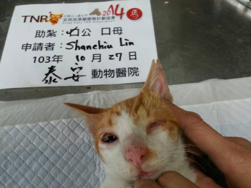誘捕者暱稱: 花卡咪 性別: 公 花色: 白底橘 誘捕地點: 前鎮鎮X街附近 結紮醫院: 泰安動物醫院 結紮費用: 700 助紮者: 已付款:Dofishx3 額外醫療費用申請: 特別說明與誘捕心情: 這隻橘白獨眼龍跟媽媽還有其他5隻兄弟姊妹住在一處廢棄空地及防火巷弄內,防火巷弄內昏暗看不清橘白的真正狀況,只知他眼睛有些睜不開,誘捕送醫發現,原來是整個左眼都不見,醫生研判失去的眼睛應是手術摘除的,因傷口很乾淨完整,無須再行任何醫療行為。隔壁的卡拉OK偶爾會給剩菜飯,還有位好心的先生會餵飼料跟乾淨的水喝,在空地還算安全,只是相鄰的是條大馬路,貨車卡車非常多,希望藉由結紮能使悲劇不再重演