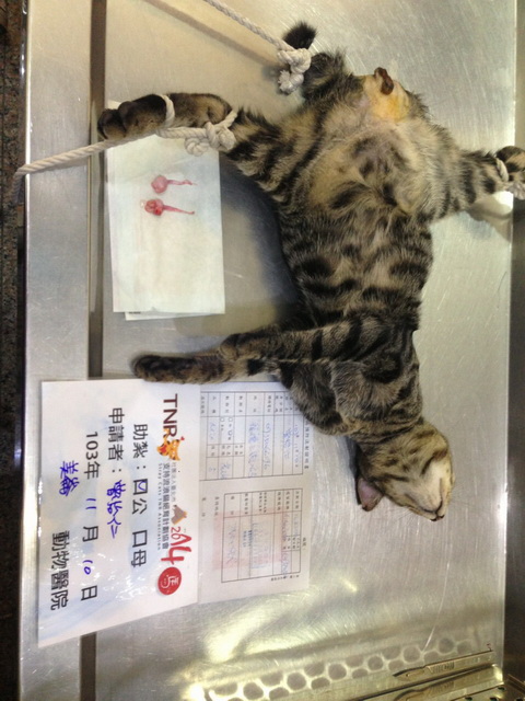 這隻虎斑叫小淘氣,是從小就開始餵養的浪貓一窩四隻,用誘捕籠抓到,紮好原地放養