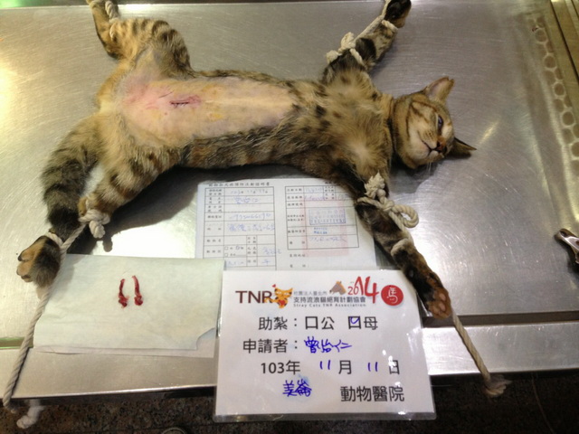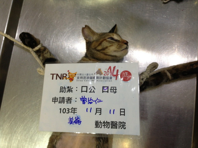 這隻虎斑叫雲雲,是從小就開始餵養的浪貓一窩四隻,用誘捕籠抓到,紮好原地放養