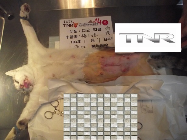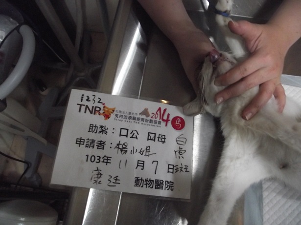 誘捕者暱稱: Katie Yang 性別: 母 花色: 白底虎斑 誘捕地點: 台北市南陽街 結紮醫院: 康廷動物醫院 結紮費用: 1500 助紮者: 已付款:SIN-YUN LIx5 額外醫療費用申請: 特別說明與誘捕心情: 11月初網友在粉絲團請求協助. 位於台北車站補習班街有一隻萬年妖精. 整條南陽街佈滿她的子子孫孫. 因為貓咪又懷孕, 補習班老師們請求協會志工協助誘捕. 志工楊凱蒂與郭冠黎一同協助誘捕. 貓咪不怕人,所以誘捕過程順利. 附近攤販都很關心她, 再三叮嚀貓咪結紮後一定要原地放回. 天冷了, 貓咪在外生存不容易. 小貓也容易腰折. 幸好趁天變冷時, 誘捕到他, 終結此生不斷生產的命運. 貓咪已回南陽街, 繼續做人見人愛的補習班街貓.