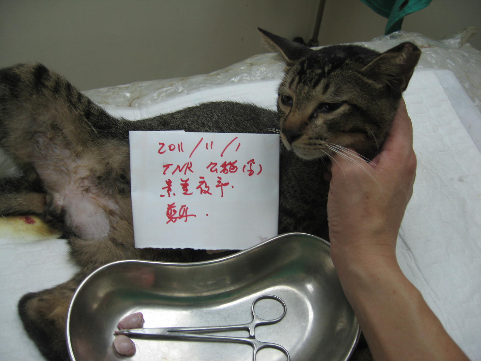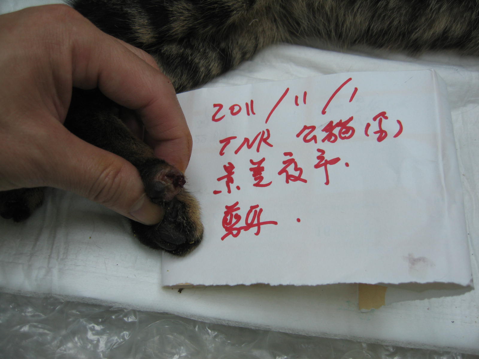 這隻貓是新來的食客,小小的公貓笨笨的,在感情不夠深厚下居然很容易的抓到,非常輕鬆,可能是餓太久了;由於腳指頭受傷怕放回會有問題所以特別打了長效消炎跟上了藥,由阿豪老闆捕捉,Mai Lin Lai代為申請!謝謝
