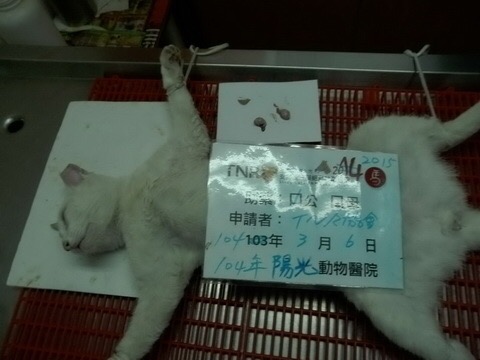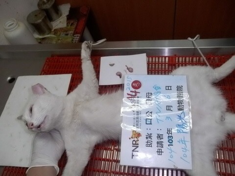 誘捕者暱稱: 臺北市支持流浪貓絕育計劃協會 性別: 公 花色: 白 誘捕地點: 寺廟 結紮醫院: 陽光犬貓專科醫院 結紮費用: 800 助紮者: 已付款:許嘉勻x1, 嚴西x1, 嚴西x1 額外醫療費用申請: 特別說明與誘捕心情: 經購地庇護中心鄰居通報,
