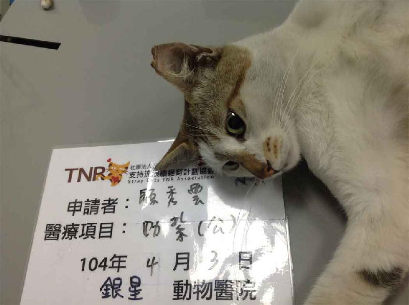這隻白底虎斑老兄就是新面孔之一,親人的他跟另一隻橘子兄就這樣被秀雲姐帶去節育了;而橘子兄麻倒後才發現已節育,所以只有虎斑兄被拿了蛋蛋!!