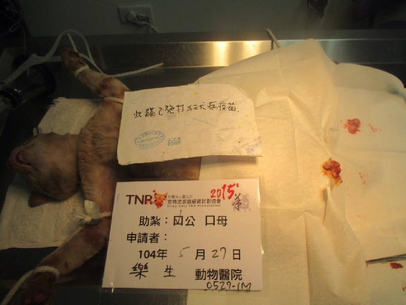 誘捕者暱稱: 謝凱伊 性別: 公 花色: 橘色 誘捕地點: 高雄廣播電台旁公園 結紮醫院: 樂生動物醫院 結紮費用: 700 助紮者: 已付款:cathyx1, 林華x1, Pennyx2 額外醫療費用申請: 鼻頭旁邊有皮膚病~開一周口服藥$400 特別說明與誘捕心情: 高雄市新疆路高雄廣播電台是我上班的電台,附近流浪貓還蠻多隻的,但還沒有看過幼貓。怕到了發情期還是有交配生下來的貓咪出來受苦。5/25誘捕到這隻大隻的公貓,發現不但被有心人士套橡皮筋之外,鼻子旁邊還有皮膚病,醫生剪開了橡皮筋還好沒有造成傷亡,另外皮膚病有開一周口服藥給他吃,5/27進行結扎。希望藉由大家的力量,讓台灣流浪貓都能免於生育