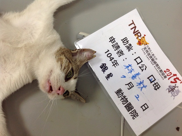 誘捕者暱稱: 花卡咪 性別: 母 花色: 白底虎紋 誘捕地點: 前鎮德X路 結紮醫院: 銀星動物醫院 結紮費用: 1100 助紮者: 已付款:花舞蝶x1, Jessica Chuangx1, Nicoletta Fon Fonx2 額外醫療費用申請: 特別說明與誘捕心情: 這隻貓超聰明,從去年抓到今年,誘捕龍換了好幾種款式,落罩式的也用過,完全不進籠,還離我越來越遠,非常沮喪。