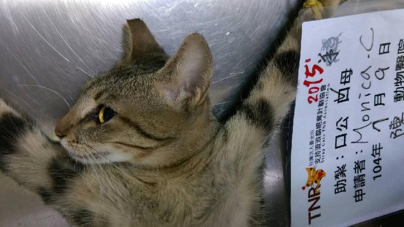 誘捕者暱稱: 埋愛葬心 性別: 母 花色: 虎斑 誘捕地點: 八德 結紮醫院: 陳獸醫院 結紮費用: 1500 助紮者: 已付款:Jokiss Chienx1, sandy changx1, RDx1, xiaomanx1, Pstar Huangx3 額外醫療費用申請: 500 特別說明與誘捕心情: 這是生活在八德的某高中附近的浪貓之一