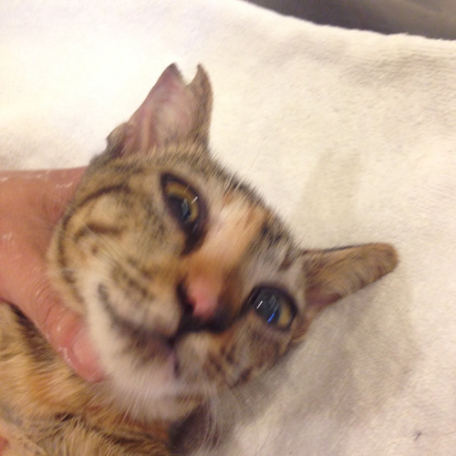這隻貓咪是我以前結紮過的市場中發現的,因為前陣子去市場買魚,看見她跟她的媽媽蹲在魚販攤位旁,所以拜託賣魚的阿伯借地方讓我設籠,順利將母女一起抓到。
