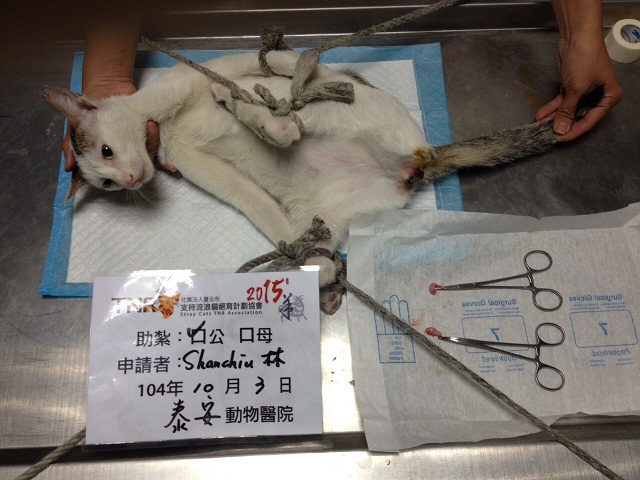 誘捕者暱稱: Shan-Chiu Lin 性別: 公 花色: 白底灰斑塊 誘捕地點: 前鎮瑞x路巷弄 結紮醫院: 泰安動物醫院 結紮費用: 700 助紮者: 已付款:Shannon Chenx1, 憨人作工作室x2 額外醫療費用申請: 特別說明與誘捕心情: 因在原本要誘捕貓美眉的巷弄屢屢失敗便轉移至前頭的停車場來設籠,這隻我原本以為她就是貓美眉(花色一樣都是白底斑塊紋)跟蹤我至停車場(距離約40-50m),等了一會兒就進籠,十分開心終於解決貓美眉結紮事
