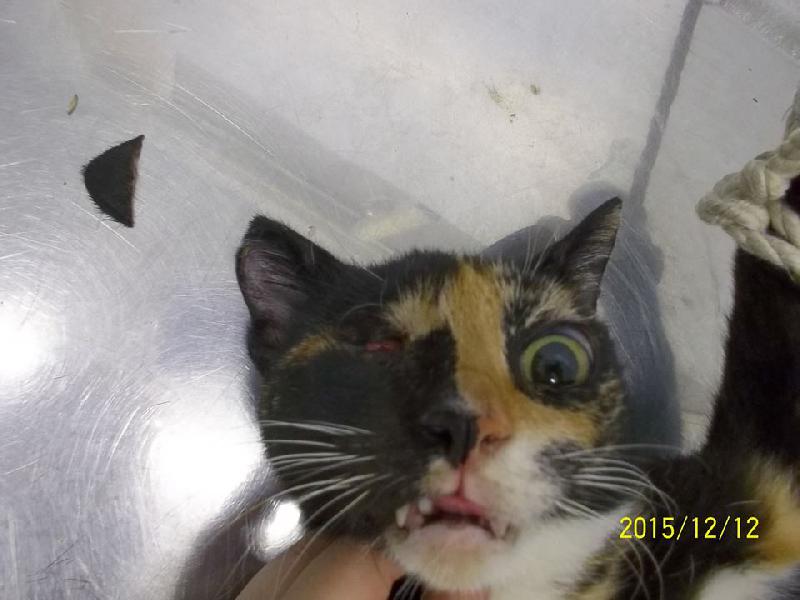 此母貓非常精明謹慎,餵養及追蹤超過兩年已生育多胎卻一直逮不到!一開始出現時右眼即失明,好不容易近日入冬能誘捕成功!右眼經醫生檢查已萎縮故無須施做摘除手術!
