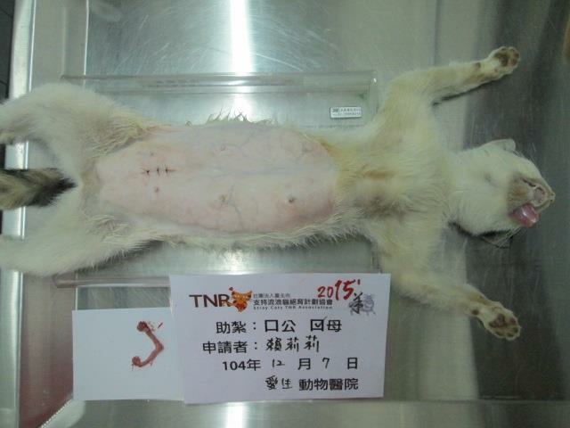 誘捕者暱稱: Lily Lai 性別: 母 花色: 白底黑班 誘捕地點: 屏東市林森路口 結紮醫院: 愛生動物醫院 結紮費用: 1500 助紮者: 已付款:林小瑛x2, 杜包子x1, focustacox1, 戀糖bearx1 額外醫療費用申請: 特別說明與誘捕心情: 白白也是在屏東市林森路與仁愛路交叉路口的咖啡廳生活的浪貓,詢問過店家,白白已經在那生活很久了,而且似乎生過幾胎,有了上次的經驗,決定在晚上貓貓點心時間進行誘捕,但白白防備心太重,根本無法靠近,只能在很旁邊偷看,而且足足放了3天才入籠,真的很聰明,12月6日誘捕成功,12月7日送至愛生醫院做節育手術,本來還擔心他肚子鼓鼓是否有身孕,經醫師檢查得知沒有真的很高興,白白會住滿7日在出院,謝謝協會幫助,更謝謝廣大捐贈者的愛心,讓浪浪免於1直生育之苦,謝謝。