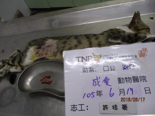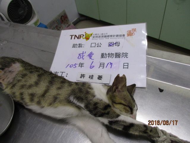 誘捕者暱稱: cherry.shu 性別: 母 花色: 白底虎斑 誘捕地點: 鹿港鎮三民路 結紮醫院: 成愛動物醫院 結紮費用: 1500 助紮者: 已付款:Shadowless Leex1, Betty Panx1, Joningx1, Pei Hong Linx2 額外醫療費用申請: 特別說明與誘捕心情: 貓友於6月中在三民路(鹿港國小附近)救援一隻後腳受傷的小貓,發現此區域也有街貓流竄,連續半個月觀察,無居民固定餵食,大約有5至6隻零星出現,於是進行固定餵食及結紮計畫!希望能減少無辜生命繼續流浪!