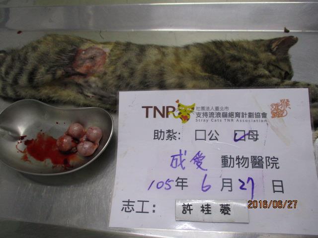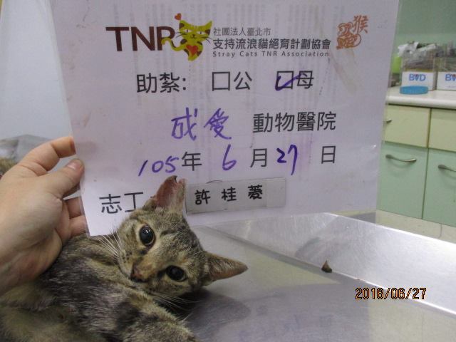 誘捕者暱稱: cherry.shu 性別: 母 花色: 虎斑 誘捕地點: 鹿港鎮館前路(民俗文物館) 結紮醫院: 成愛動物醫院 結紮費用: 1500 助紮者: 已付款:Emma Chih-Wei Max1, Renee Wux1, 可樂x3 額外醫療費用申請: 特別說明與誘捕心情: 這是去年底因貓友求助事件才發現及開始餵養的區域,雖然居民對街貓還算友善,但給予的都是廚餘且直接丟在水泥地,因為不忍街貓只吃廚餘瘦弱,於是從一星期加菜一次進而三日來餵一次,直到近三個月每日來餵食,先前已誘補一隻公貓TNR,因母貓有過懷孕跡象,但過了2個月卻沒有任何貓仔出現,擔心又發情,於是進行誘捕,送醫照超音波後,雖然已有胚胎,但是尚未有心跳,於是醫生仍可執行節育手術!