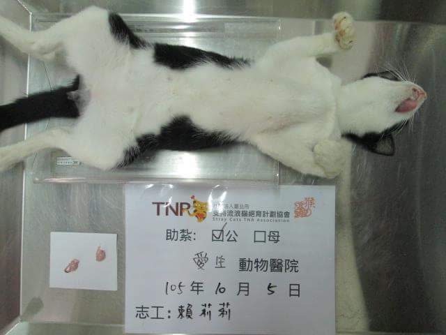黑白貓貓在林森路與仁愛路交叉咖啡廳附近出現1段時間了,每每經過都會發現他身影,詢問店家後,貓貓會出來覓食,常流連咖啡廳附近,但很不親人,10/3下午經過店家同意,放誘捕龍,10/4晚上才順利誘捕進籠,10/5送愛生醫院,住院3天即可出院原放,希望替貓貓tnr ,以防被驅趕,也希望他們免於生育之苦,更謝謝協會的資源,讓貓貓和人們和平相處。