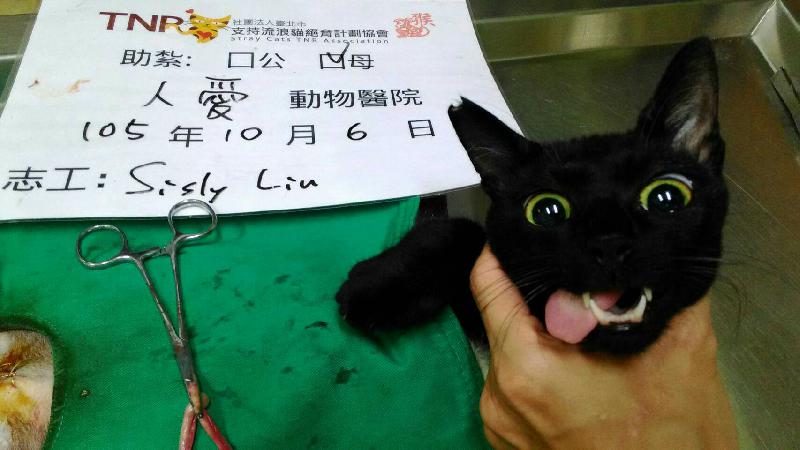 看起來黑黑大眼的貓咪,原來肚子藏有白毛,看她臉感覺她很幼齒,應該剛長大成貓^^ 紮完晚上一樣記得來吃飯哦^^ 感謝大家幫助浪貓結紮