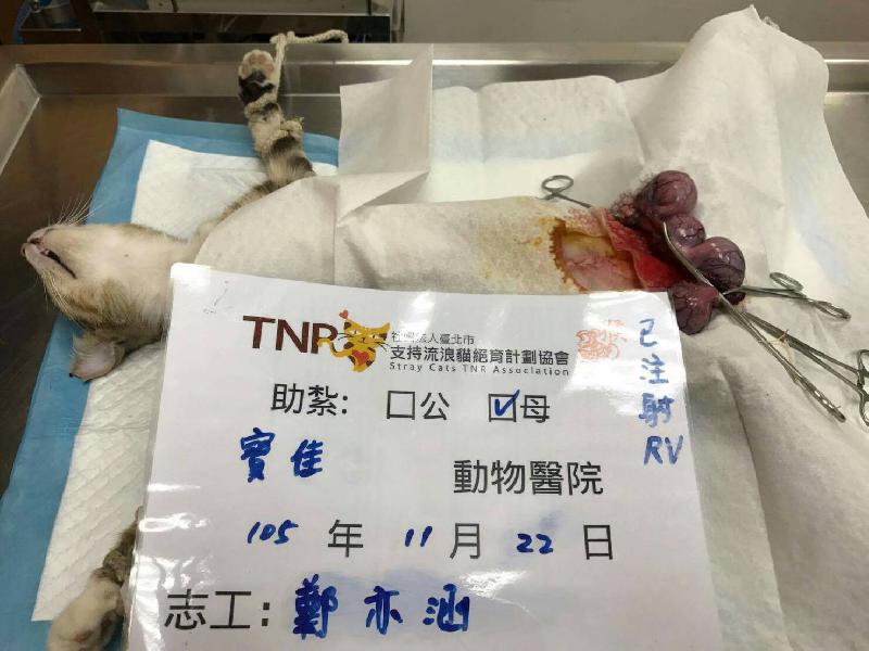 貓兒是我常去的一家麵店附近的浪浪,附近的居民和麵店老闆都有在餵食,跟麵店老闆詢問貓兒的習性後,約好在麵店結束當日營業時,借場地讓我們試著誘捕帶去TNR,試了兩天,順利誘捕成功,隔天一早送院進去結紮,醫師來訊告知,開刀發現貓兒已有胚胎,為了終止流浪命運的延續,只好向這四個小朋友說抱歉了,出院後會回放原處,因為附近居民與麵店老闆都也很願意繼續餵食,也很感謝有此平台協助!