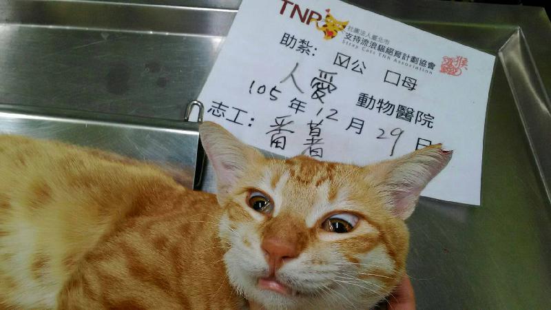 這隻公大橘是最先出現在港興路的住宅區內的貓咪,平常與住戶的關係還可以,可是就是很不親貓,入夜後老喜歡找別的貓麻煩,他的麻煩到最後變成我的麻煩,住戶老找我麻煩,叫我別餵了,因為他很吵,所以趕在年底前一定要紮了他。謝謝協會提供的平台 專案號碼PRO 00295