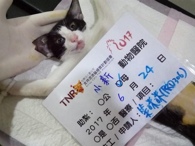 這隻黑白小母貓是前一隻全黑色母貓媽媽的小孩,上個月發現了媽媽帶了四隻小貓出來,心裏還感到非常懊惱!當時目測四隻小貓只有三個月左右,還太小不能結紮,因怕母貓又懷孕,所以趕緊抓紮了媽媽,然後就慢慢等小貓長大。但在等待的這一個月,小貓從四隻變成三隻,而且看小貓也長大了不少,心想應該趕緊抓紮了,以免小貓漸漸獨立亂跑,那不是機會越來越少嗎?所以就趁著天氣好沒有下雨,放籠抓紮了。