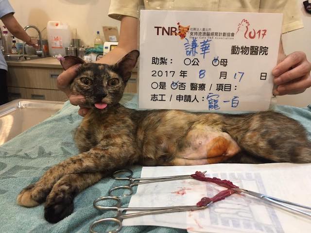 連續生產2胎的玳帽媽媽,上次誘捕到時還在哺乳,這次終於等到小貓近2個月了,趕快誘捕到來結紮,感謝協會幫忙∼玳帽終於可以不用在生孩子了,助紮費還請大家幫幫忙∼