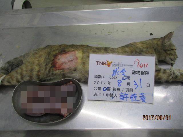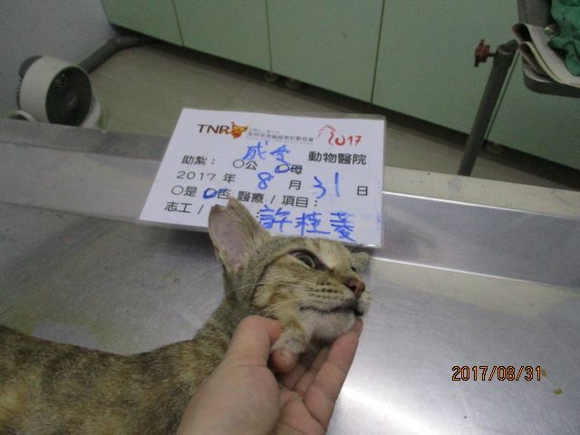 誘捕者暱稱: cherry.shu 性別: 母 花色: 虎斑 誘捕地點: 鹿港鎮永祥街50巷 結紮醫院: 成愛動物醫院 結紮費用: 1500 助紮者: 已付款:林灩x5 額外醫療費用申請: 特別說明與誘捕心情: 此母貓於去年底大腹便便出現在餵養區,觀察一段時間後已有固定出沒,但警覺性極高於今年生產完仍無法誘捕成功,且小貓也未帶出,無法判定是否還在哺乳,小貓是否能自行覓食,隨著時間又過母貓帶小貓出現時又懷孕了!只好又等待第二胎斷奶帶出小小貓時,好不容易誘捕成功,經超因波檢查發現又懷胎,評估若放回再誘捕,肯定非常困難,經醫生評估後進行取胎結育手術!