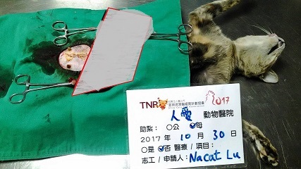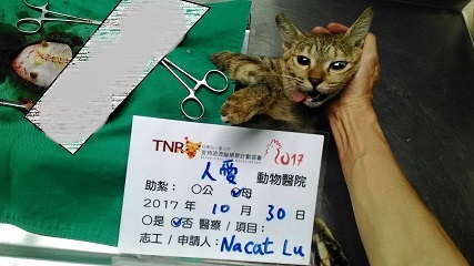 誘捕者暱稱: Nacat Lu 性別: 母 花色: 虎斑 誘捕地點: 一心路小公園 結紮醫院: 人愛動物醫院 結紮費用: 1200 助紮者: 已付款:傅建誠x4 額外醫療費用申請: 特別說明與誘捕心情: 這隻貓是最近跑來吃飯的新朋友.每次都是怯生生的躲在車子下等等等.超級愛吃罐頭.對飼料沒什麼興趣.發現她有時會甘冒被其他貓咪兇.也會想偷吃別人碗中的罐頭.發現這個特點後.就趕緊準備籠子誘捕她.只是她實在太膽小了.籠子發出一點聲響就飛也似的跑了.好不容易經過了一段時間後.讓她漸漸放下心防.才進了籠.