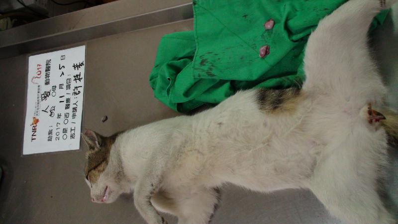 此公貓於10月份才冒出在餵養區,雖然原區母貓地域性較強會驅打此公貓,但經一段時間觀察,公貓也很堅持留下等待放食,故進行抓紮結育,以免發情又亂跑造成其他區域未結紮母貓懷孕!
