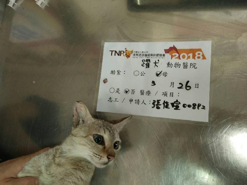 3/25捕抓,3/26送紮,這隻貓咪的臉蛋清秀,毛色很特殊漂亮,是米灰色虎斑母貓。牠這一胎生了3隻小孩,一隻橘貓,一隻黑貓,一隻冒似暹羅貓,聽鄰居阿嬤說牠年紀還小,但已經生過一胎,不捨得牠這麼辛苦在外流浪,請我幫忙抓紮,原放後她們會繼續餵養。謝謝協會和善心人士的幫忙。