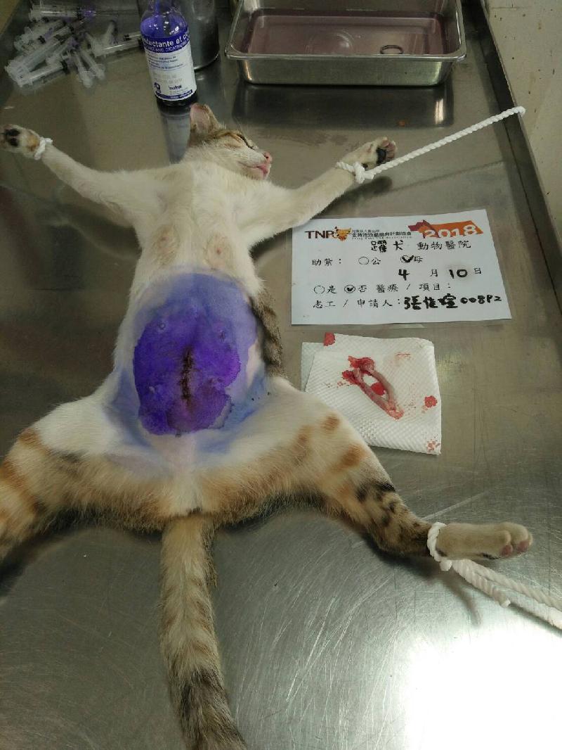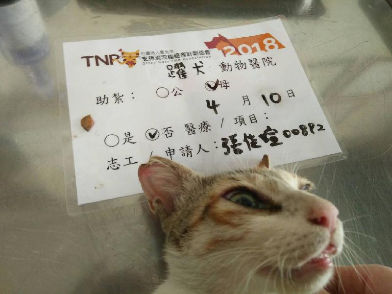 我晚上去抓紮的時候,在黃色路燈下原以為這隻是白底虎斑公貓,隔天早上要帶去醫院時才發現牠是白底三花母貓。牠也是在橘貓區出沒的貓咪,很高興這一次抓到母貓,就可以幫那區減少未來貓咪的出生數量了。 謝謝協會的平台和愛心捐款人士的幫忙。