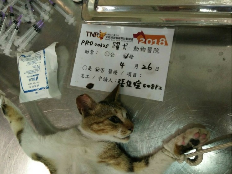 專案00325-2,這隻白底虎斑母貓是在安平花店後方鐵皮屋前抓到的,開刀時才發現懷有2隻不足月的小寶寶,雖然心有愧疚,還是必須執行。安平老街的浪貓太多,只要有一隻漏網之魚,不久之後就又有一批新貓出現,真的令老街的居民覺得很困擾,希望這次可以把當地浪貓都完成結紮,讓人貓可以和平相處。謝謝協會和善心捐款人。
