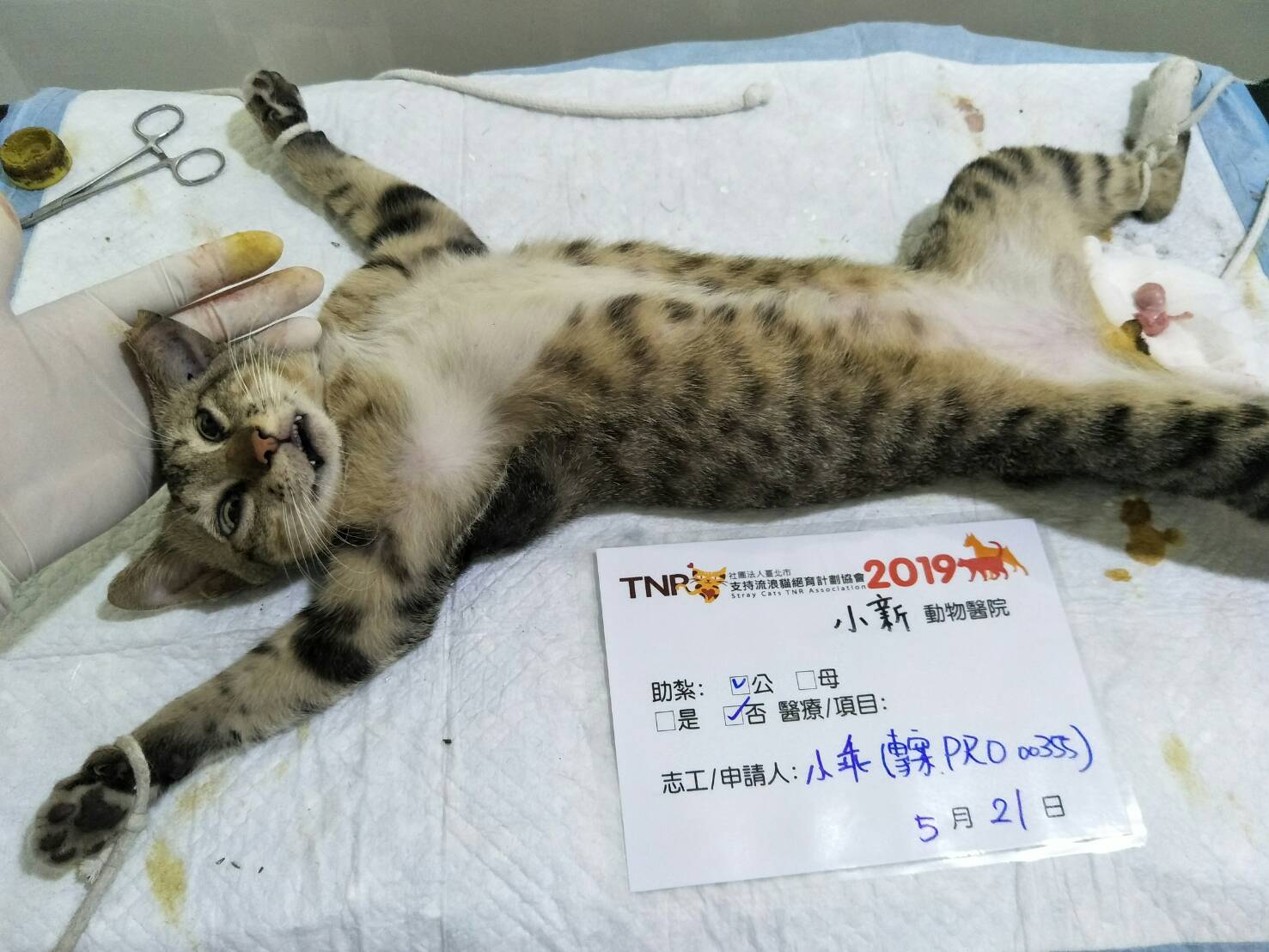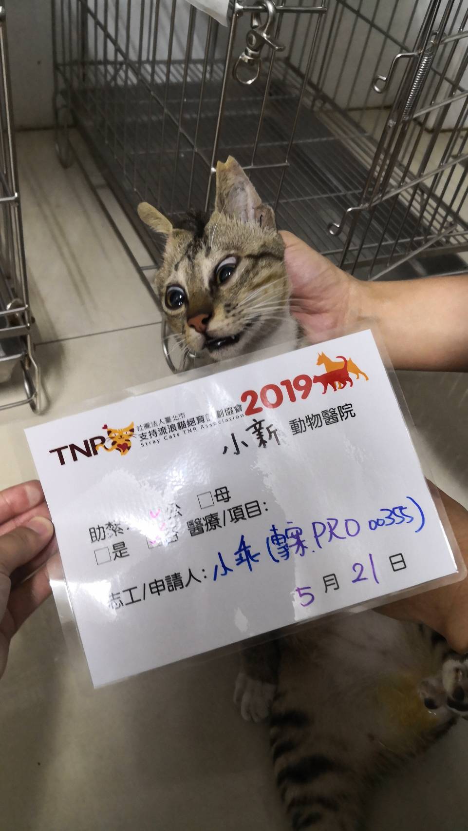 誘捕者暱稱: 小乖 性別: 公 花色: 咖啡色虎斑 誘捕地點: 高雄市新興區文化路44號 結紮醫院: 小新動物醫院 結紮費用: 700 助紮者: 已付款:郭娜x1, Sherryx2 額外醫療費用申請: 特別說明與誘捕心情: 108/5/20深夜23:30高雄的大雨,本以為喵喵躲雨應該不會出來吃飯了!但是,老天爺應該同情我對浪貓的不捨!它還是唯一出現的喵,真的很快的就進籠,讓我順利地撈捕第四隻貓(前三隻因為尚未申請專案助紮,自己付費送泰安跟回生動物醫院結紮)這是我專案的第一隻,我希望今晚的深夜,我還可以順利帶浪貓完成結紮!感謝協會的相助,分攤了我的壓力,現在的我更努力用功抓紮浪貓孩子,結紮了,就不用擔心貓隻的生育能力了