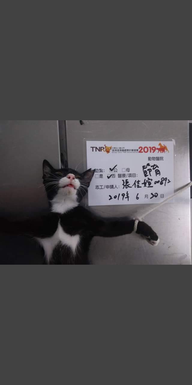 花色: 白口罩的黑白賓士貓 誘捕地點: 台南市北區
