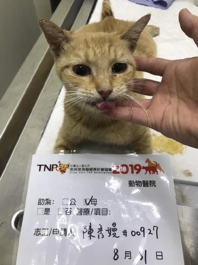 住家附近瘦小的橘貓,因為有口炎,一直都是貓群裡最瘦弱,最後出來吃飯的那隻,也因為本身有病痛,總是很害怕人,就算身體很虛弱,也逃不過街上母浪貓的命運,一胎接著一胎的生產,此次難得終於捕捉到她,希望借助眾人的力量,結束她不停懷孕哺乳的命運。