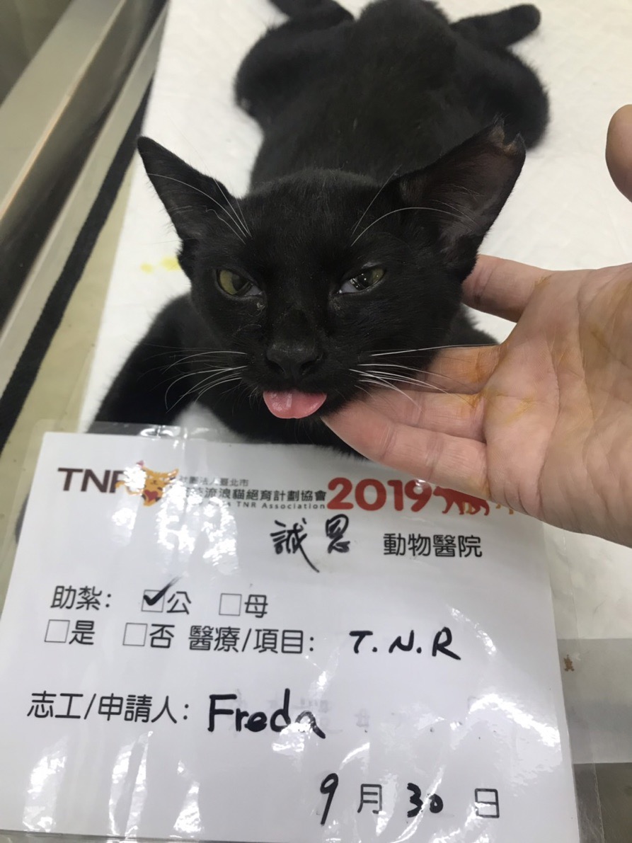 眼睛古溜古溜的小黑貓,雖然怕怕的,但是沒有咬沒有抓,還好颱風夜前夕抓到了,讓他免受颱風的驚恐。感謝TNR協會及善心人士。
