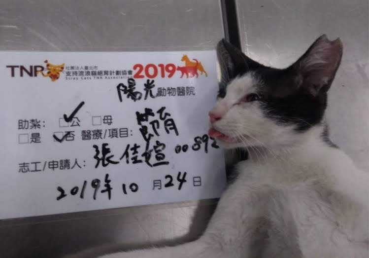 108.10.23 晚上於鄰居花店前抓到的黑白公貓。10/24送紮。鄰居說這隻是附近的母貓生的,生了5隻,都是黑白系列或黑色的,因為當時貓咪還小,現在慢慢長大了,所以請我幫忙抓紮,才不會越生越多,引起附近鄰居不滿。
