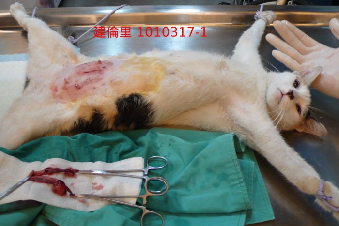這貓是一位朋友通報,母貓帶二隻小貓,在仁愛圓環附近一便當店,店老闆在餵養的浪貓,17日上完志工訓練課程,順路過去看看情況,是否需要誘捕,這貓與便當店老闆親近,會讓他摸,就請老闆準備一個米袋,由他幫一手抓住貓脖子,放進米袋里,送去結紮。