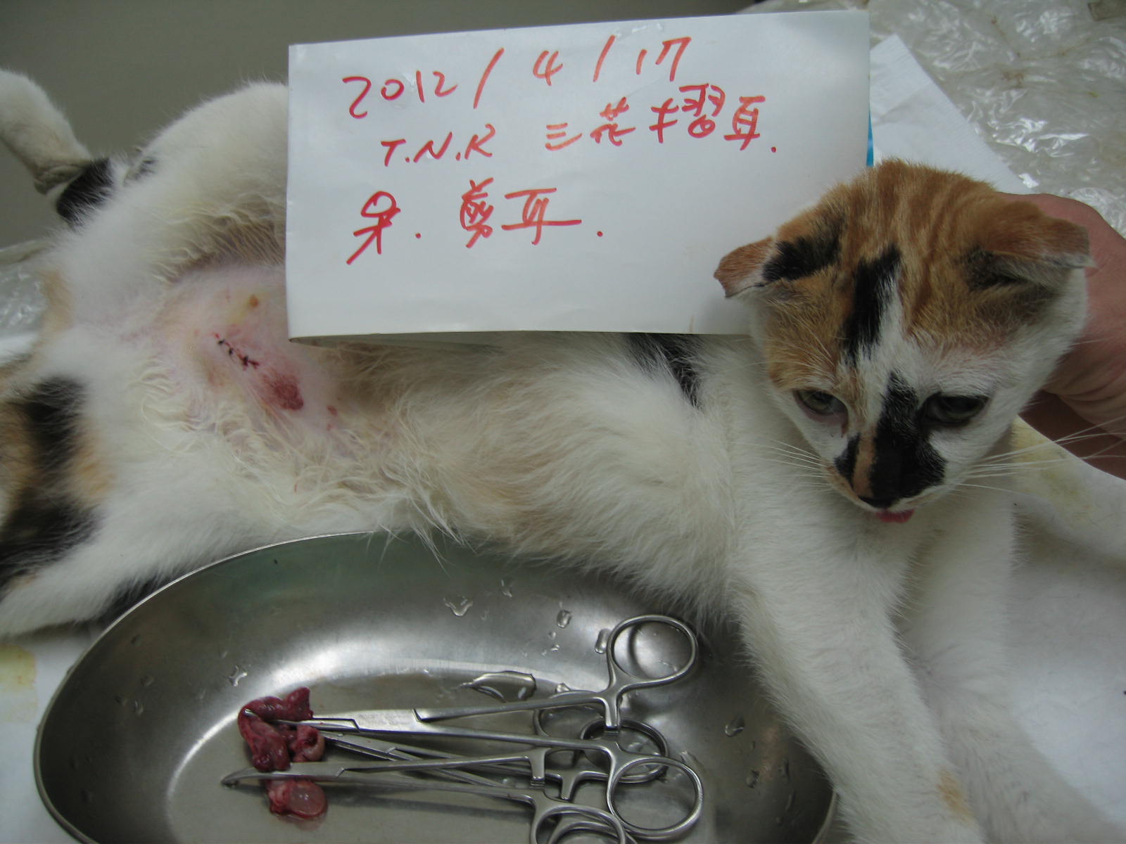 誘捕者暱稱: 阿湯 性別: 母 花色: 三花折耳貓 誘捕地點: 新北市新店區安康路三段(社區公園內) 結紮醫院: 誠恩動物醫院 結紮費用: 1500 助紮者: 已付款:臺北市支持流浪貓絕育計劃協會 額外醫療費用申請: 特別說明與誘捕心情: 這隻折耳貓的媽是隻多產的三花母貓,已嘗試好幾回都捉不到母貓,經觀察母貓一年好像生了二~三次,每次都會見到零星幾隻小貓等待母貓哺乳,只能等到小貓約三月斷奶,再趁機施予捕捉、結紮。至今共捉到三隻,其中二隻已順利送養,近期在原地附近又捉到第三隻,其在外流浪多時,好不容易捉到給予結紮,性別是母的。醫生說此折耳貓似有生過一胎而且最近又在發情、子宫已有異樣,還好來得及結紮。感謝協會的幫助及各位愛心人士的贊助,我對此感到欣慰,在小小的巷弄角落有你們的幫忙,謝謝!!
