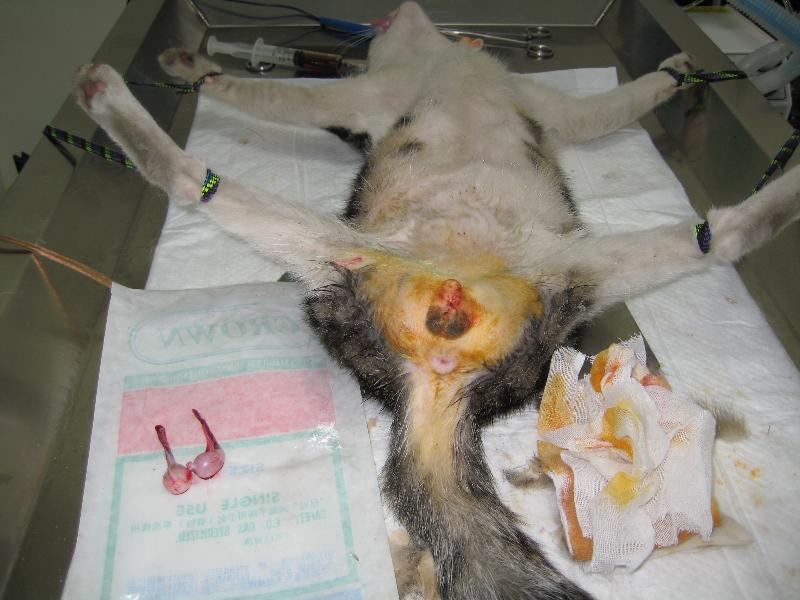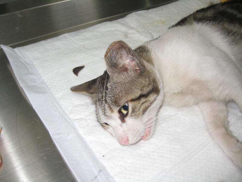 這隻貓有漂亮的漩螺紋,可是兇巴巴,看他身上禿了好幾塊毛就知道,一天到晚在打架,醫生有給予上藥,希望紮完後,脾氣能溫和一點~
