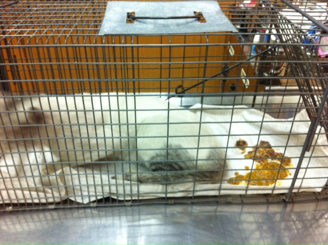 華夏技術學院周邊小吃店附近抓到的貓,可能都吃廚餘,打了麻醉劑5分鐘內從嘴巴吐出一堆蛔蟲,醫生說蛔蟲太多,胃也有才會吐出來,驅蟲針費用志工吸收,浪貓的生活很辛苦,感謝助紮人士以及福林醫師給予浪貓折扣優惠!