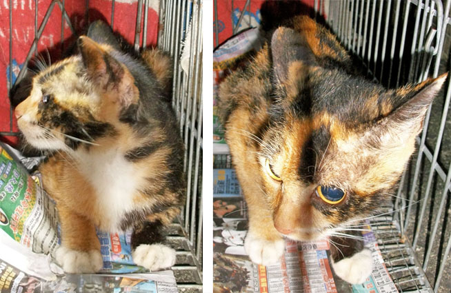 應該是習慣被餵食的浪浪,對敲罐頭和搖乾糧的反應很大,誘捕籠才設好10分鐘就落網了。本尊很小隻+幼齒臉但聽說已經生2胎以上囉....家人曾經半夜看過一直疑似袖套小花的貓在路邊扒垃圾袋覓食T_T