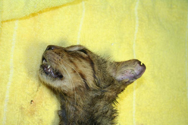 來時離的不會很近也不是遠.吃ㄌ2天.本以為會故定來吃飯飯...誰知從此不見.其間有一次一閃兒過.昨晚我放飯時衝出來(不誇張)就一直吃.我還加開罐頭..ㄟ..脖子怎麼凹下去..我以為是象皮筋.天ㄚ.是項圈..貓咪你離家出走嗎.還是被棄.瘦到不行 趁吃飯食趕快回家拿籠子..乖..帶你看醫生伯伯喔..