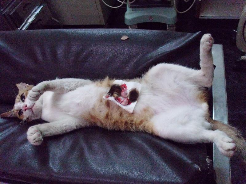 今天等了一整天~上午跑進去結紮過的貪吃貓~等到下午快六點了想說要收攤ㄌ~竟才來這隻公貓~真高興!有收穫~