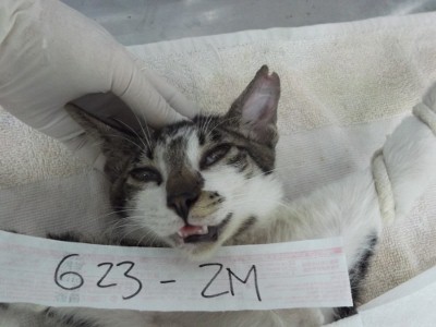 這一群貓看起來都差不多大, 應該是同一批, 同媽媽生的. 今天全都抓到共四隻. TNR的貓會做剪耳記號, 才不會被重覆誘捕手術. <623-2M>