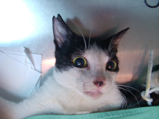五分街捕捉的黑白母貓,近年來不斷生育,架設誘捕籠半小時都不肯進籠,愛心小姐說貓貓很挑食喜歡高級的罐頭,於是在籠內放置魚條,不到三十秒就進籠。