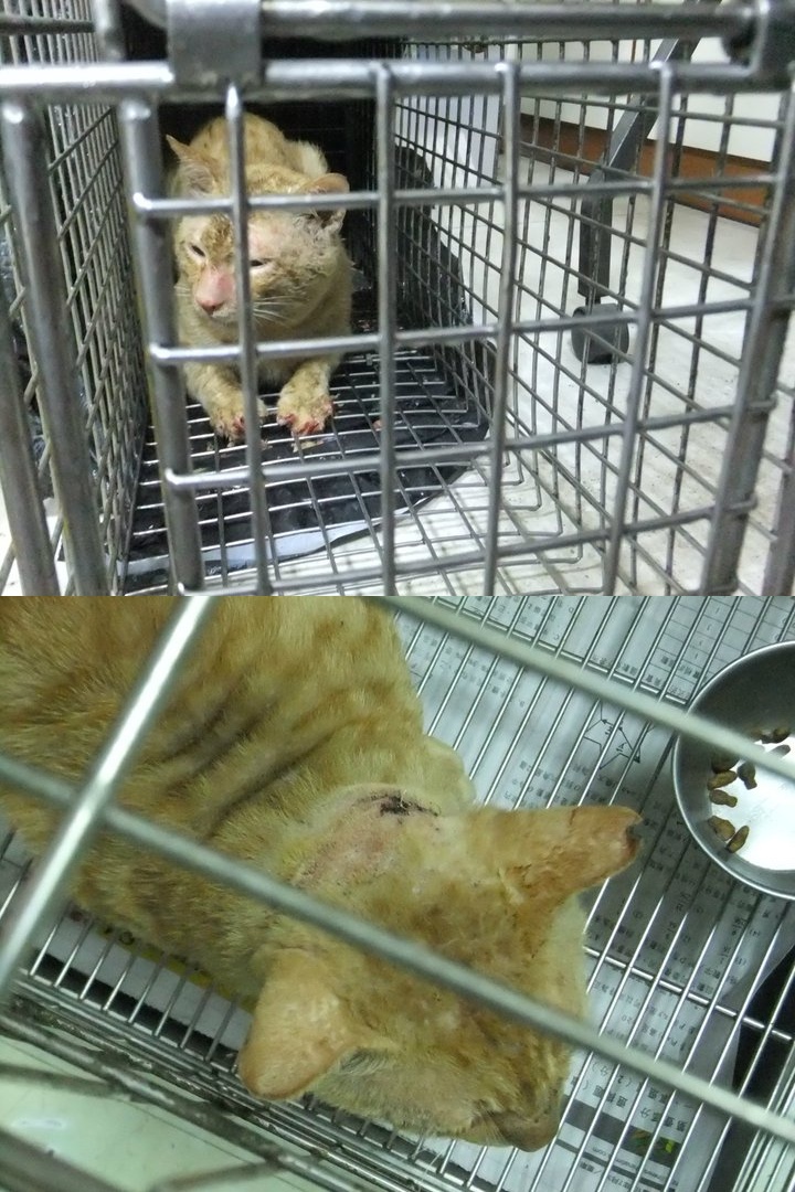 近看之下, 發現牠有皮膚病, 且頸後有個大又深的傷口. 醫師判斷 這新傷痕 疑似被其它公貓所咬, 需要縫合(共縫四針)& 住院治療皮膚病。